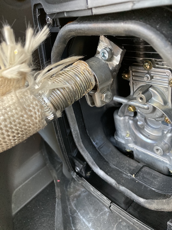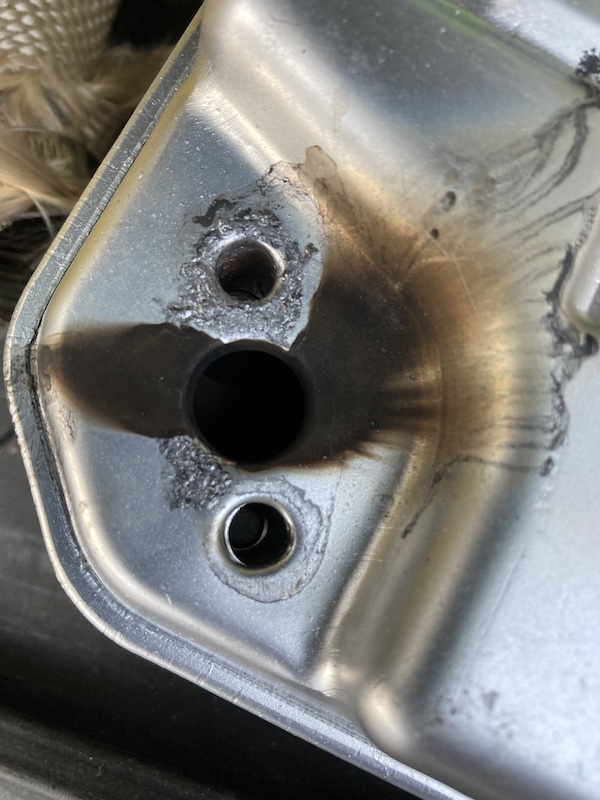 Esa irroitti äänenvaimentimen ja tadaa,,, Tehtaalla kasaaja oli ”pikkaisen” huolimattomasti laittanut tiivisteen paikoilleen ja se olikin melkein poikittain siellä, jolloin, kuten kuvasta näkyy, päästänyt osan pakokaasuista sivuilta ohi. Ja minä olin koko ajan luullut, että asentamani pakoputki tuosta äänenvaimetimesta eteen päin on se vuotaja ollut.