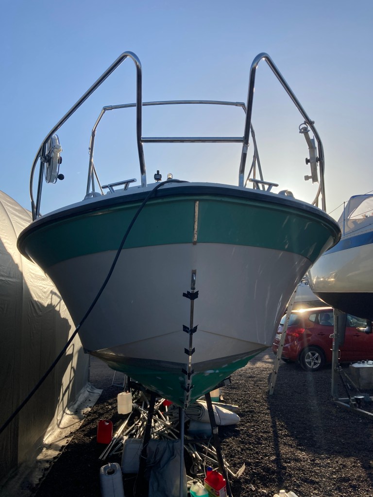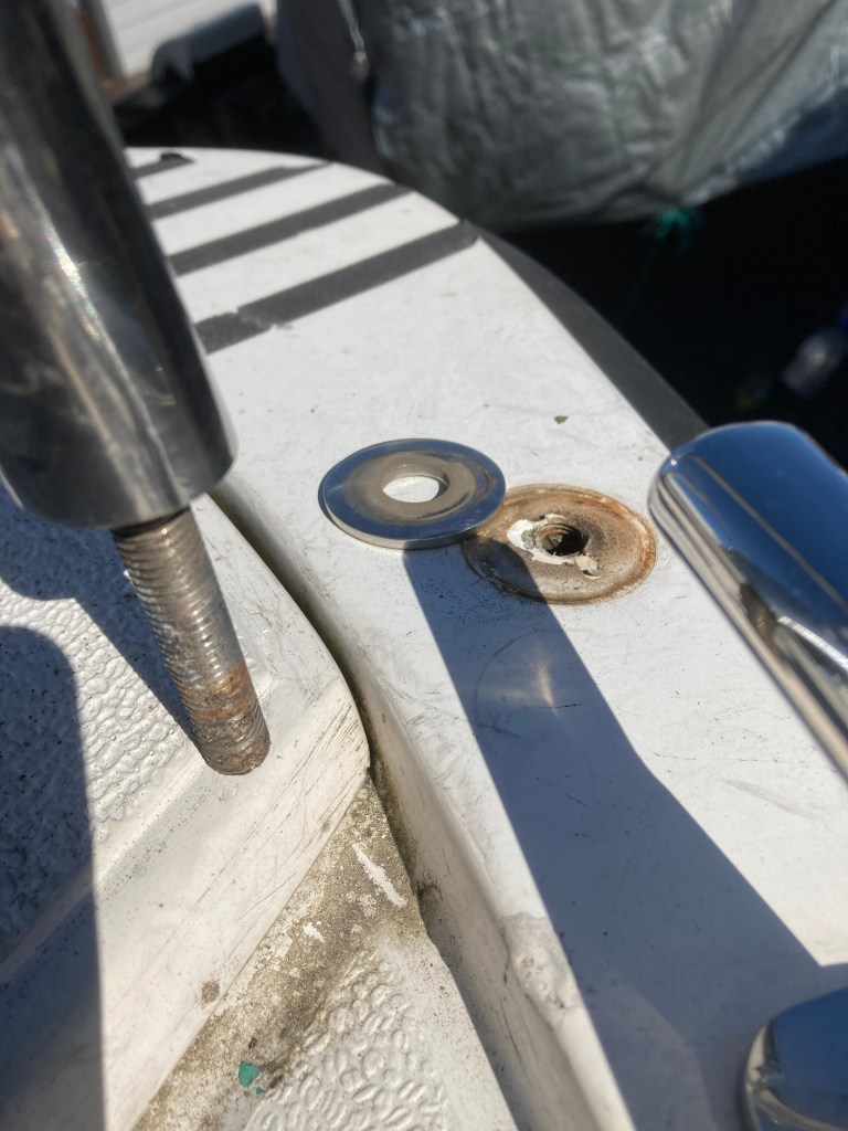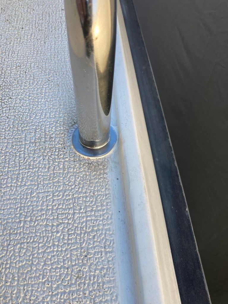 Viime kesänä kävi ilmi, että kaiteen läpivienti vuotaa kabiiniin pikkuisen kovemmalla sateella. Siispä ei auttanut muuta kuin irooittaa koko kaide.