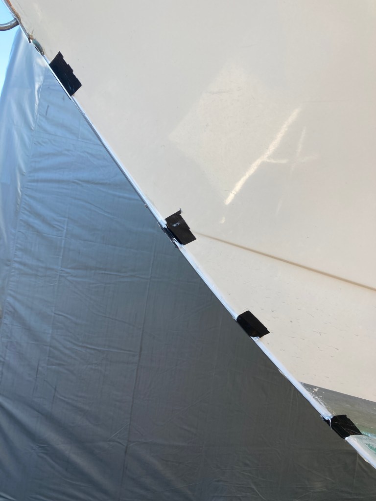 Epoksi kitillä olin paikannut kolhut ja ruuvin reijät, joten nyt oli sitten uuden köliraudan liimaus.