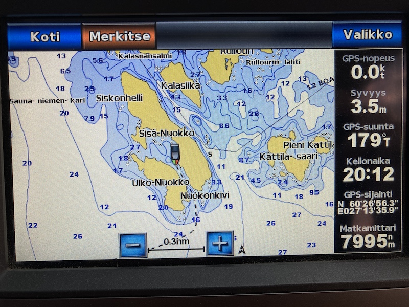 Tällä kertaa suuntasimme Nuokkot-saariryhmään, jossa käytiin viime vuonnakin. Tosin, silloin oli niin sumuista ja märkää, ettei oikein päästy saareen tutustumaan. Nämä Nuokot ovat Haminasta etelään ja Kotkasta itään. Ajomatkaa Kotkasta kertyi melko tarkaan 10 mailia.