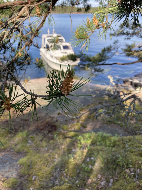 Päätimme lähteä vähän puolenpäivän jälkeen lähemmäksi kotisatamaa. Ovat huomiselle luvanneet länteen kääntyvää tuulta, joten vältyttäisiin ihan vasta-aaltoon ajamiselta, ainakin parin isomman selän kohdalla. Pellingin selän ylitys ennenEmäsalon niemenkärkeä saattaisi olla aika kuoppainen huomenissa. Oli se nytkin, mutta nyt se tuuli pohjoisesta, joten se tuli sivusta. Toki, välillä nopeuden sai laskea 16-17 solmun paikkeille, ettei ihan ”hakkaisi” niin paljon. Kansi tuli kyllä pestyä siitepölyistä, jos sinne sitä viimeöisen sateen jälkeen jotain oli jäänyt.