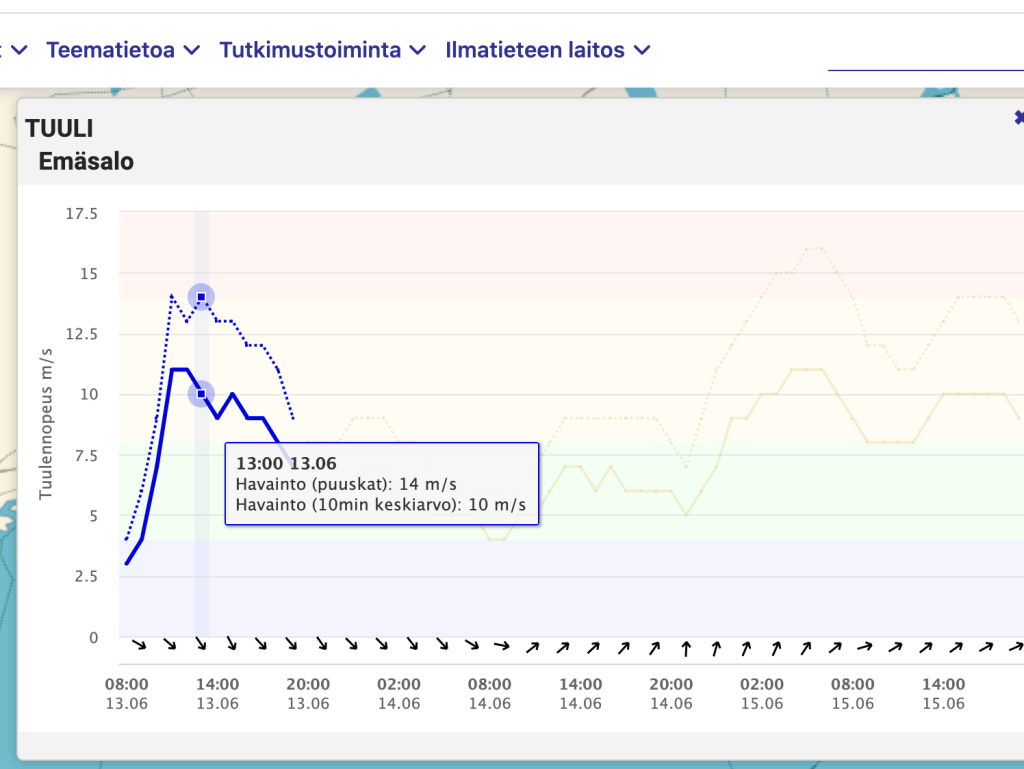 Tässä toteutunut tuuli Emäsalossa. Ennusteen mukaan piti olla siinä kuuden-seitsemän metrin paikkeilla, vaan meni ”vähän” yli.