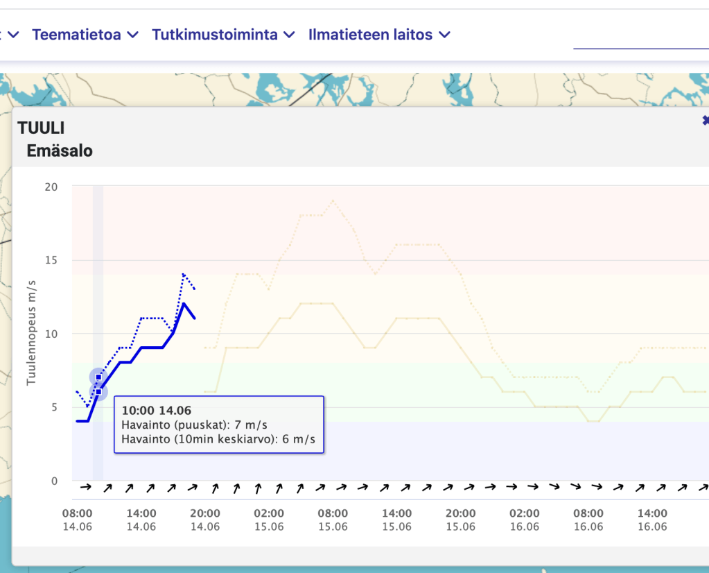 Siinä kuvaa tuulen kehittymisestä, Me lähdettiin yhdeksän aikoihin ajelemaan, eikä hetkeäkään liian myöhään.