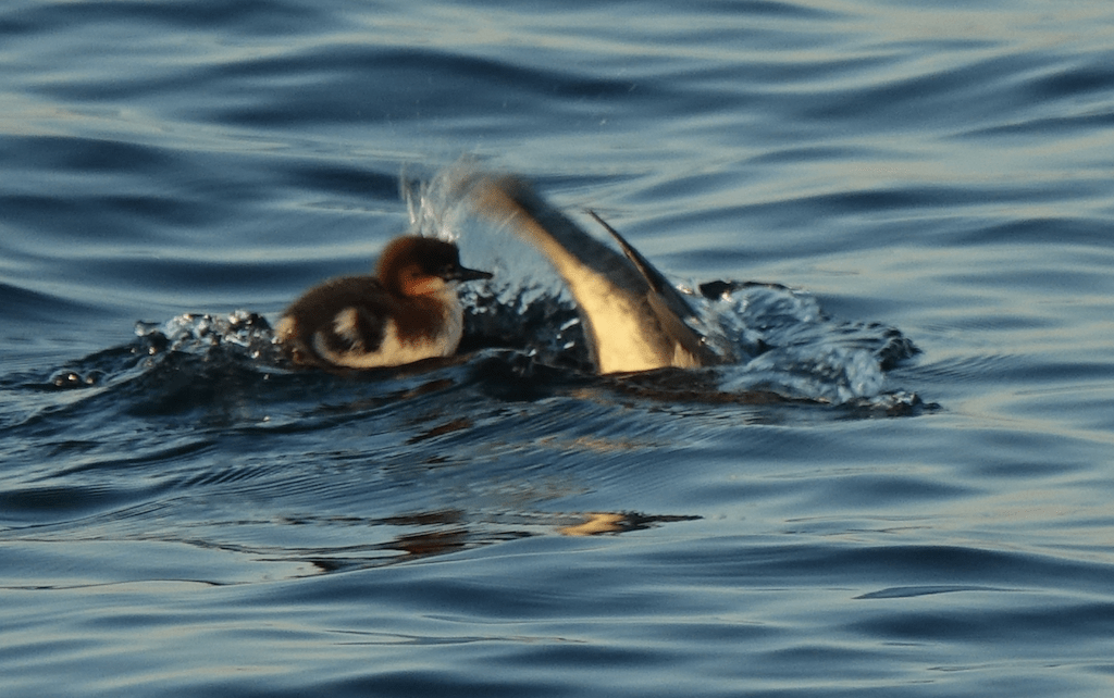 Seuraavassa hetkessä emo sukelti ja hups, poikanen putisi kyydistä.