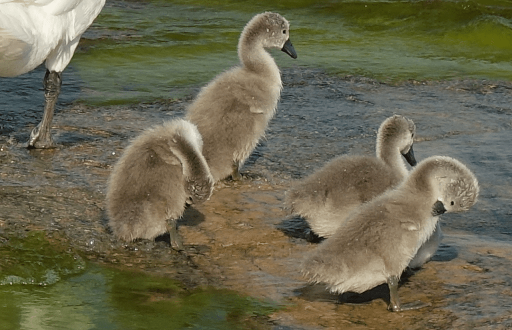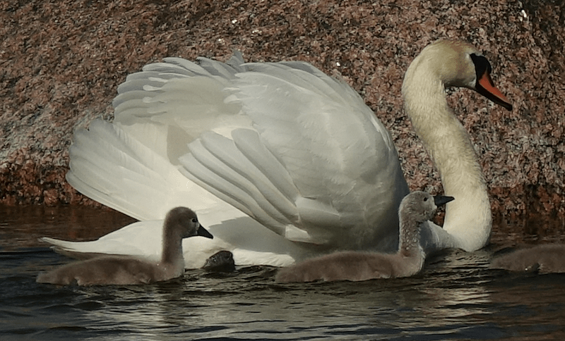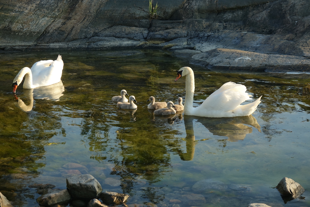 Joutsenperhe pyöri aika ajoin ruokailemassa aivan veneitten vieressä, välittämättä kauheasti meistä.