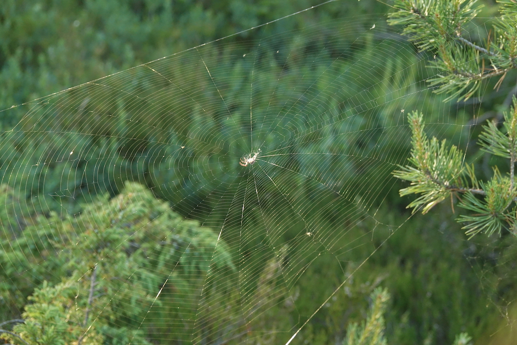 Tämä hämähäkin luomus sai jäädä paikoilleen. Kävin vain ikuistamassa, kun sattui tuo valaistuskin kohilleen.