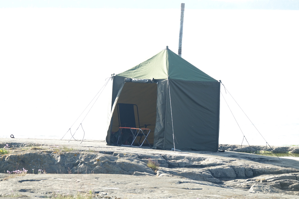 Viereemme tulleen purkkarin porukoilla oli saunakin mukana. Tämän he pystyttivät aivan pohjoiskärkeen ja lähelle meren rantaa.