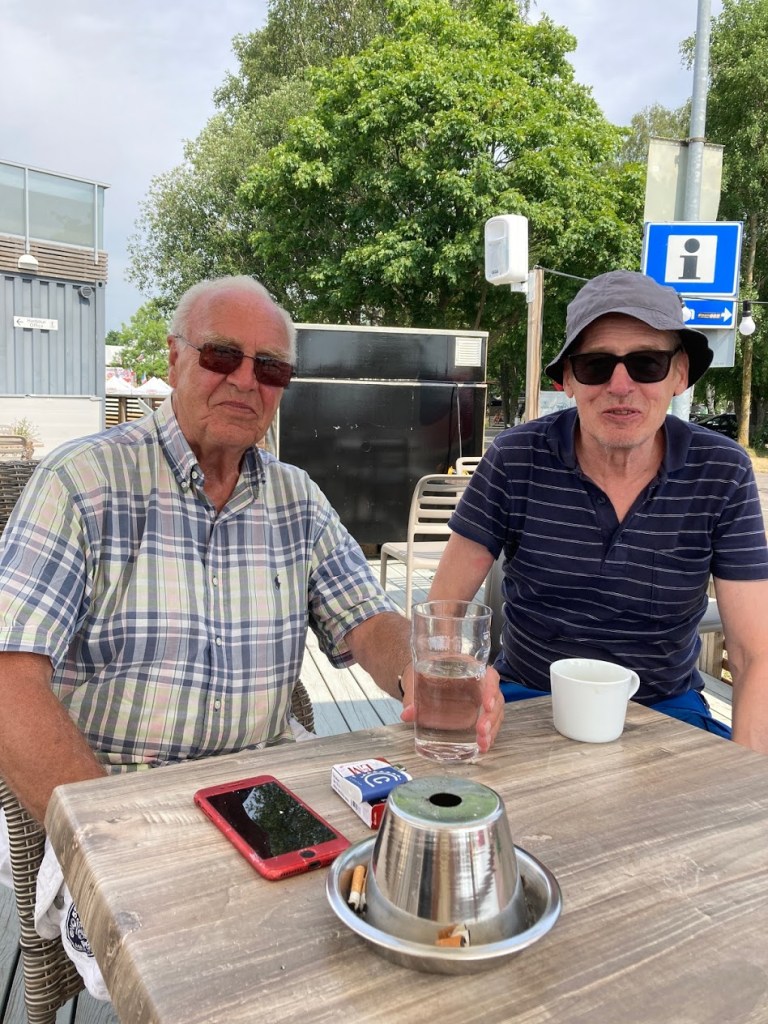 Kun olimme vielä kiinnittelemässä keulaköysiä kiinni Hangon satamassa, kurvasivat Paula ja Ari avoautollaan aivan veneemme kohdalle ja tulivat moikkailemaan. Koska meillä meni vielä tovi, he menivät edeltä HSF:n ravintelin terassille odottelemaan meitä. Kun meillä oli hommat saatu tehtyä, liityimme seuraan. Siinä taas turistiin kuulumiset ja vähän muitakin asioita. Oli jälleen kiva nähdä vanhoja kavereita, edes tämän kerran vuodessa tapaamisen merkeissä. Pari tuntia vierähti kuin humaus.