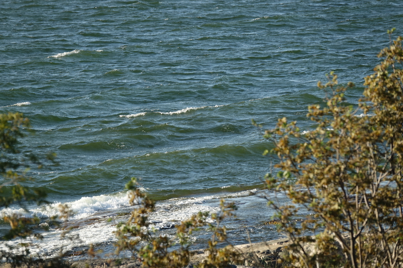Kiinnitimme keulan siihen läntisempään, jossa on aika syvä ranta. Yksi vene oli jo läntisessä kärjessä, mutta poistui paikalta, kun tuuli alkuillasta nousi 7-8 m/s lännestä. Samalla meidän veneemme alkoi sivulta tulevien aaltojen vuoksi keinua aika ajoin turhankin paljon. Ennusteet lupailevat tuulen suunnan kääntyvän pohjoiseen, jolloin toivottavasti keinunta hieman hellittää.