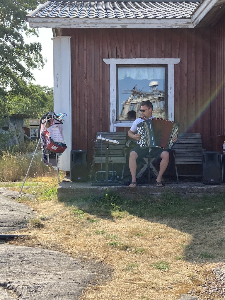 Puuvenekokoontumisen kunniaksi oli kuppilan edessä oikein pelimanni musisoimassa.
