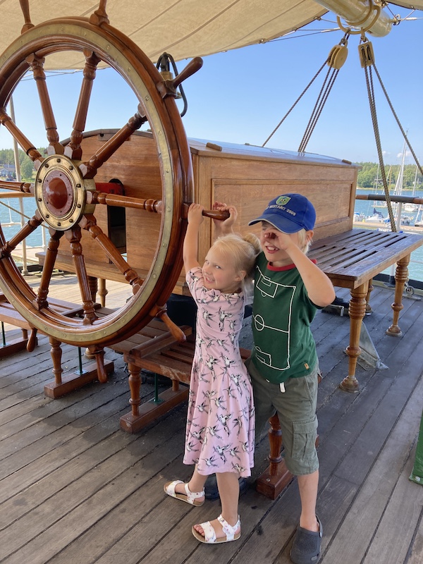 Sisarukset kilpailivat perämiehen hommasta, joten tekivät sitä yhdessä. Veikalla taisi olla minikaukoputki mukana 😉