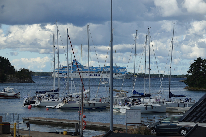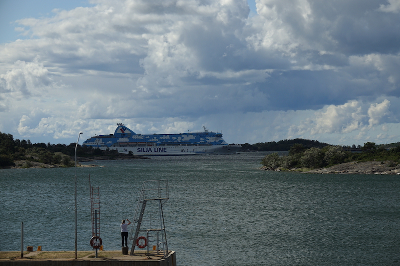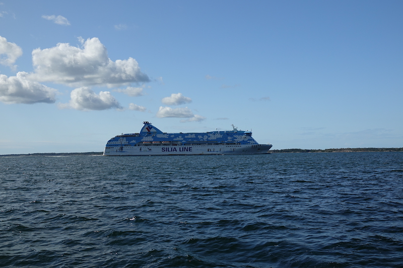 Oikaisimme kaakon suuntaan, sitten kapeaa valkoista vettä pitkin etelään ja lähestyessämme väylää, vastaan tuli Silja Line´n laiva.