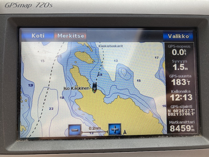 Ei jääty aamulla kovinkaan pitkäksi aikaa neniämme kaivelemaan Iniöön, vaan suuntasimme Sarzan keulan kohti koillista, tosin vähän mutkitellen, kun oli kiviä ja saaria edessä.