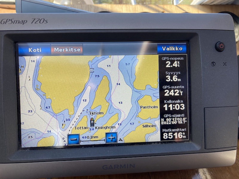 Tämä partiolaisten merkitty luonnonsatama, joten pitihän se tulla katsastamaan. Yllätävänkin syvää aika lähelläkin rantaa. Niemen toisella puolella näytti olevan kaksi metriä vettä, kun vähän pyörittiin sielläkin.