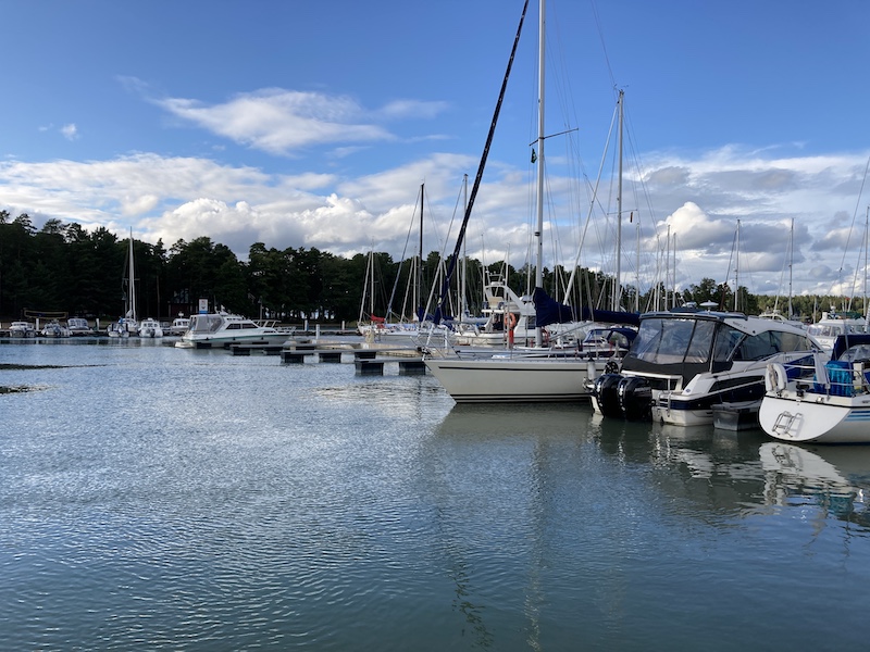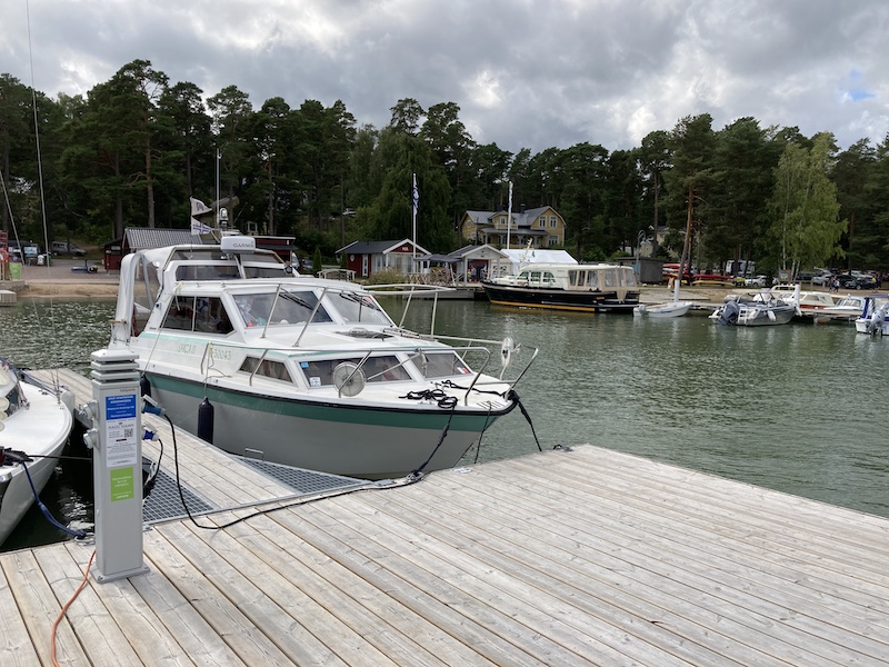 Nauvon satama on sen verran suojainen, ettei ollut edes tällaisessa puuskaisessa tuulessa vaikeuksia laituriin parkkeerata.