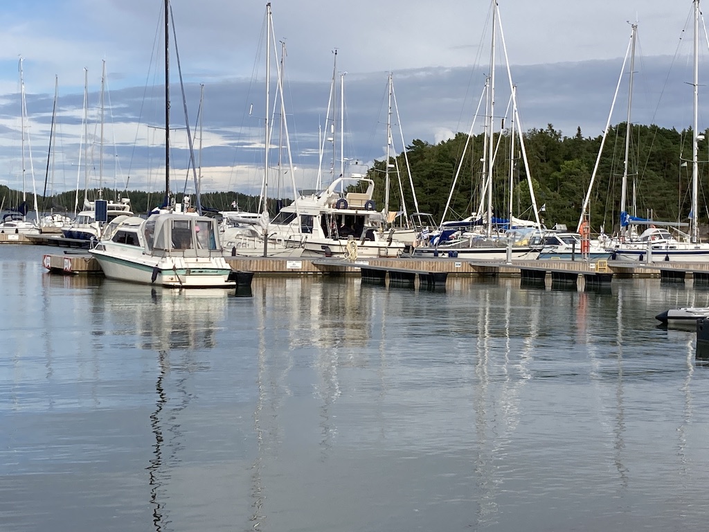 Yöllä satoi ja ukkosti ihan oikeesti ja tuuli repi venettä sinne tänne. Onneksi ei tarvinnut miettiä, pitääkö ankkuri tai kalliokiilat. No, siksihän me tänne tultiinkin, suojaan.