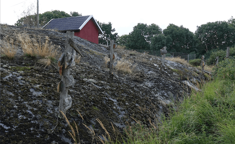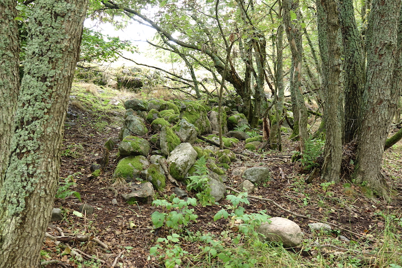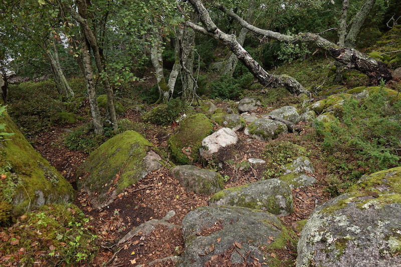 Ovat saarelaiset aikoinaan olleet ahkeria, kun kiviä kasailleet pitkin saaria tällaisiksi jonoiksi. Ja vielä useaampaan kohtaan. On siinä saanut kiviä kantaa. Olivat kuitenkin jättäneet tänne rinteeseen aika monta kiveä. Tätä pitkin saatin sitten liukastella mäkeä ylös.