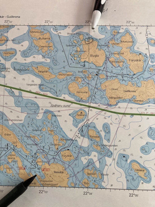 Kuvan yläreunassa on lähtösaari ja tuonne alareunaan tultiin, Gullkrona jää siten melkein väliin. Yllätyksekseni siellä oli yksi purjevene.