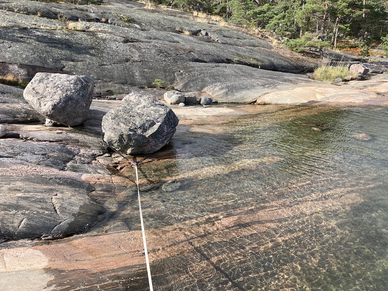 Sitähän sai kumisaappaat laittaa jalkoihinsa, että sai tuon köyden kiven ympäriltä pois. Kyllähän sitä pitää ottaa huomioon monenlaisia asioita, kun ankkuroi ja kiinnittyy luonnonsatamiin, mutta nyt kyllä unohdin täysin vedenkorkeusennusteet.
