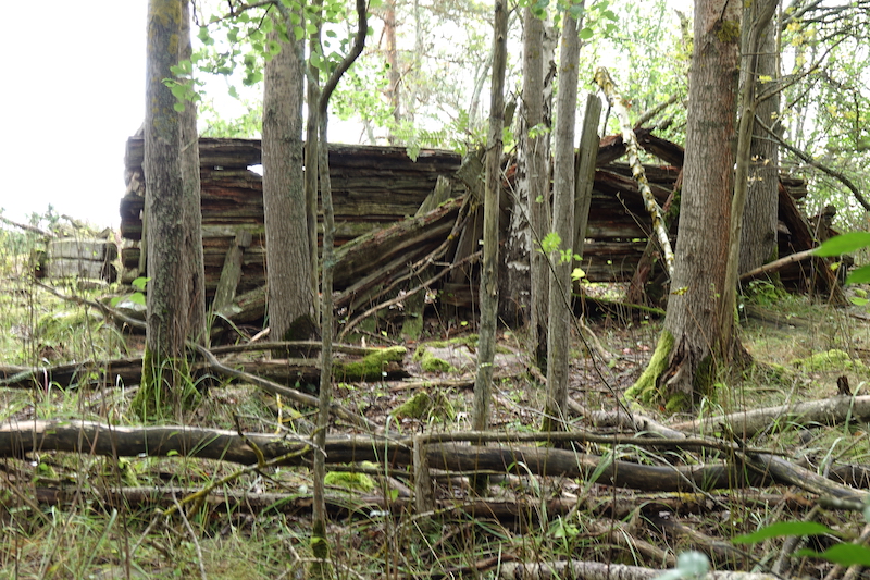 Stenskärin puolelle kun palattiin ja itäpäähän polkua seurailtiin, tuli sortunut talo lepikossa vastaan. Aika rämettynyt oli tässä kohdin saarta maisema.