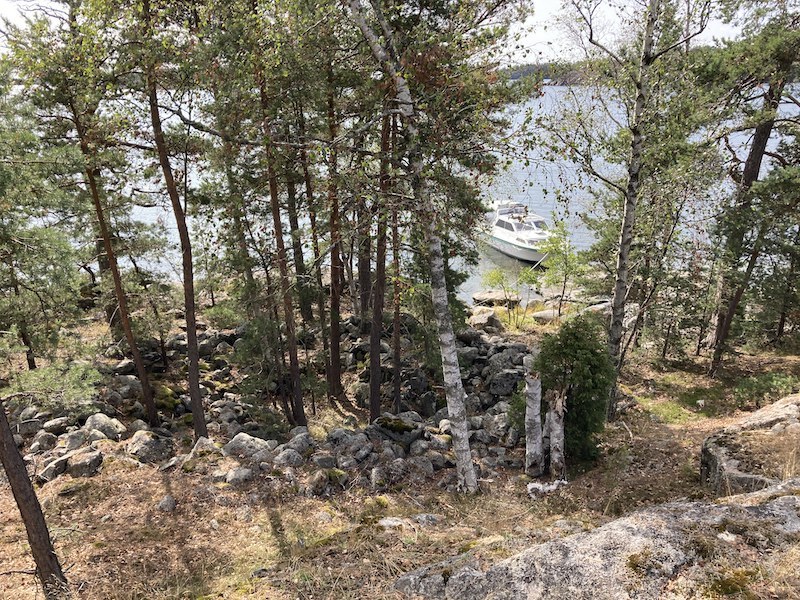 Saaressa heti kiinnityksemme lähellä kiinnitti huomiota ympyrään ladotut kivet. Mielestäni nämä on ihmisen asettelemia eikä luontoäidin. Keskellä olevat puut kertonevat jo aikaa kuluneen jonkin verran siitä, kun kivet on tähän ladottu.