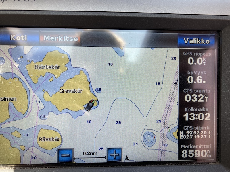 Välipysähdyspaikaksi valitsin Grevskärin, jossa ollaan oltu aikaisemminkin, mutta tuolloin saaren länsipäädyssä. Nyt sinne käy aika kova tuuli, joten tutkailtiin täältä eteläpuolelta rantoja ja löydettiinkin kohta, johon voitiin kiinnittyä.