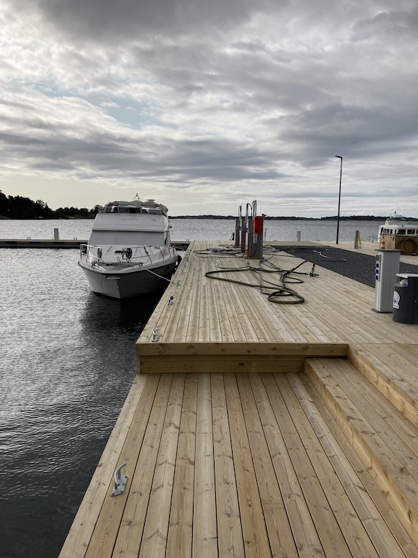 Tällä uudella tankkauspaikalla oli aika kookas vene parkissa. No, olisihan siinä molemmin puolin ollut kyllä tilaa parkkeerata tankaukselle, mutta ihmettelen suuresti, miksi tuo vene alun alkaen jätetty tuohon, kun tilaa olisi ihan vieressä ollut vaikka kuinka ja jättää asiointipaikka tyhjäksi.