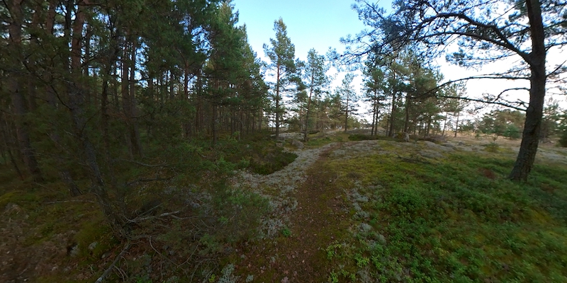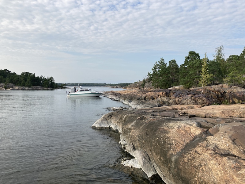 Yleensä olemme tuon vähän kaukaisemman niemen kärjessä, mutta kun tänne tulimme, kävi siihen ikävä puuskainen tuuli, joten valitsimme tällä kertaa tälläisen paikan. Syvä, hyvä ranta, pitkillä liinoilla puihin. Tässä kyllä saisi kalliokiilatkin hyvin kiinni, sen verran on veneen lähistöllä hyviä halkeumia kalliossa.