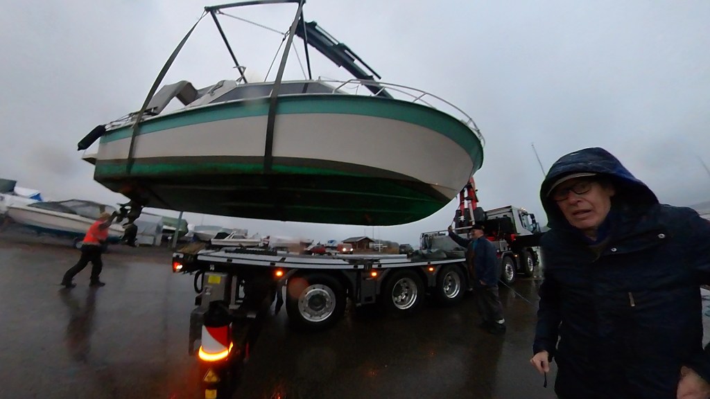 Onnekseni näin rannassa piipahtaessani toisen nosturiauton ja hän suostui nostamaan Sarzan jo seuraavana aamuna, eli perjantaina. Siispä aamulla rantaa, eikä sää ollut todellakaan suituisa. Satoi ja tuuli. Oli pieniä haasteita saada vene turvallisesti irti laiturista, mutta onneksi onnistuin siinä.