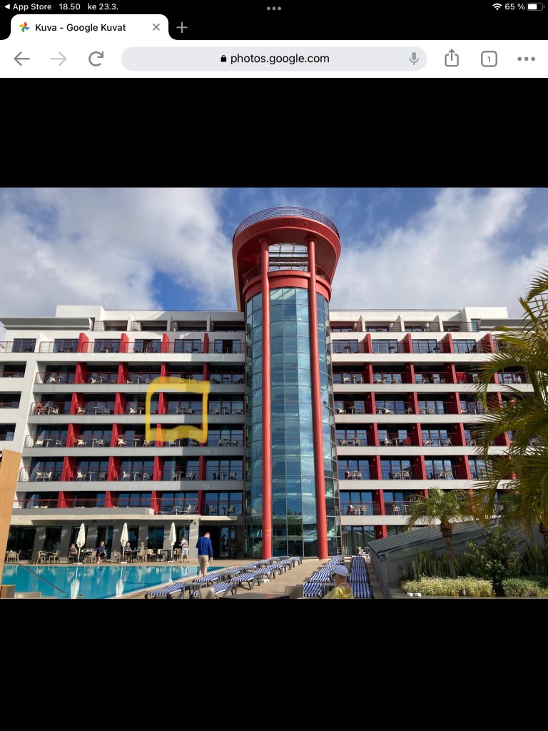 Hotellin kuvassa ympyröity parvekkeemme, josta merelle upeat näkymät.
