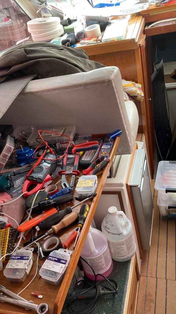 Ja kun askartelee, on välillä sotku sen mukaista veneessä. Onneksi Madam ei tule katselemaan, mitä puhastelen 🙂