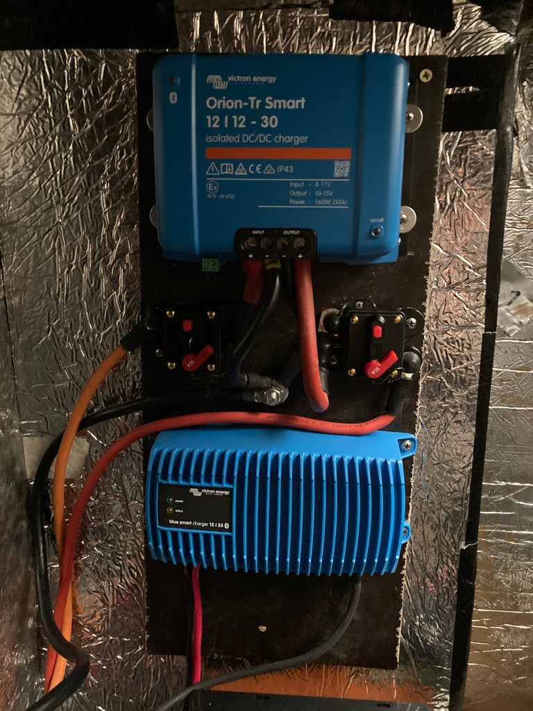Oli siis niiden asennus, uusine johdotuksineen. Hylkäämääni lyijyakkujen johdotukset hupipuolelta menivät täysin uusiksi, koska entisessä systeemissä niillä pystyi myös starttaamaan koneen, mutta nämä uudet eivät kestä startin tarvitsemaa suurta virtapiikkiä. Samoin koko latausjärjestelmä piti vaihtaa, koska koneen laturi saattaisi palaa, varsinkin hiljaisilla nopeuksilla jäähdytyksen pienentyessä. Niinpä hankin Suomen akuilta Victron energy Orion-Tr DC-DC Converter’in, joka lataa lyijyakulta, (startti), kun sen jännite ylittyy 13,5 volttia, eli käytännössä koneen käydessä. Lisäksi piti ostaa toinen maasähkölaturi, koska jo olemassa oleva Mastervolt ei osaa ladata yhtä aikaa lyijy- ja lifepoa. Kaikkien väliin tietysti sulakkeet, jotka nyt ovat tuollaisia automaattimallisisa. Lisäksi asensin yhden uuden sulaketaulun, jonka kautta menee kaikki ”hupi”laitteet, kuten jääkaappi, webasto, radio ja oikeestaan kaikki, mitkä ei liity ajamiseen.