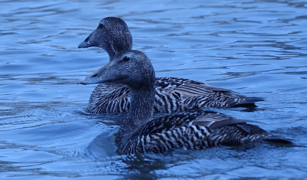 Haahkat ovat yleensä kaempana rannasta, mutta muutama yksilö uskaltautui ihan veneemme peräpuolelle, josta sitten näppäsin kuvan. Urokset ovat jo hävinneet paremmille apajille ja jättäneet naaraat hoitamaan poikaset.