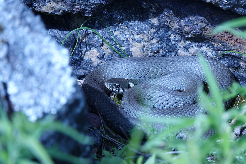 Hokasin melkeinpä heti tänne tultuamme rantakäärmeen. Se on ollut jo muutaman vuoden täällä, koska vilahduksia nähnyt usein, mutta nyt sain kunnon kuvan.