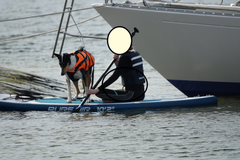 Naapuriin tuli purkkari ja jossain vaiheessa tyttö lähti suppailemaan. Päättivät antaa koirallekin mahdollisuus, mutta alkuun ei ollut oikein innostunut. Eivät meloneet pitkälle. Sen sijaan tyttö kävi kyllä, jos nyt ei ihan pitkällä, niin kuitenkin meloskeli. Jopa veneen kippari kävi suppailemassa ja otteista päätellen ei tehnyt sitä ensimmäistä kertaa.