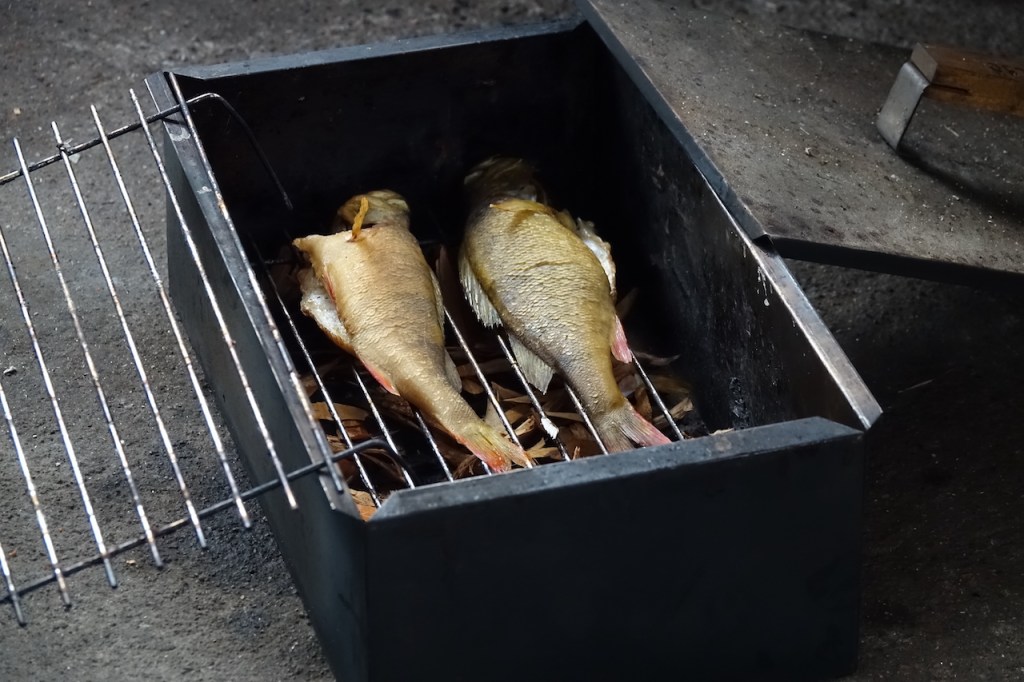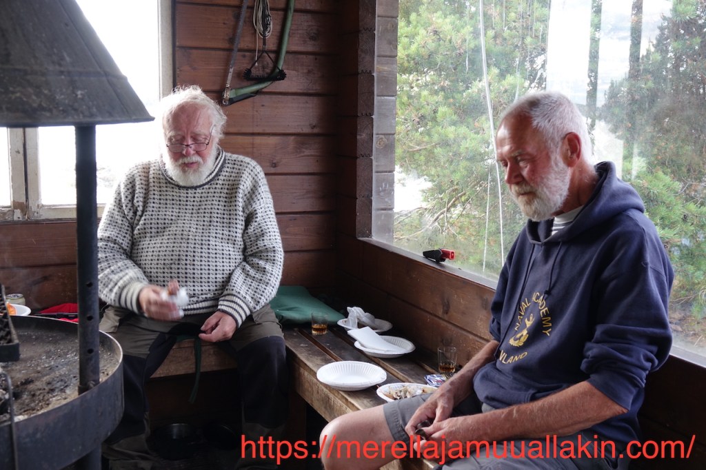 saari-isännät pienellä ruokatauolla, josta minäkin sain osuuteni. Tuoreita savuahvenia. nam