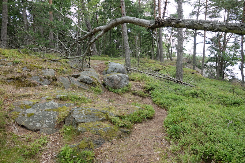 Ja jos keli ei salli aivan rannalla kävellä, menee polku metsässä seuraten rantaa. Meinaan jos idästä oikein puhaltaa, näillä kallioilla kastuu ja jos ei ihan kastu, ovat kalliot liukkaat meriveden pärskeistä.