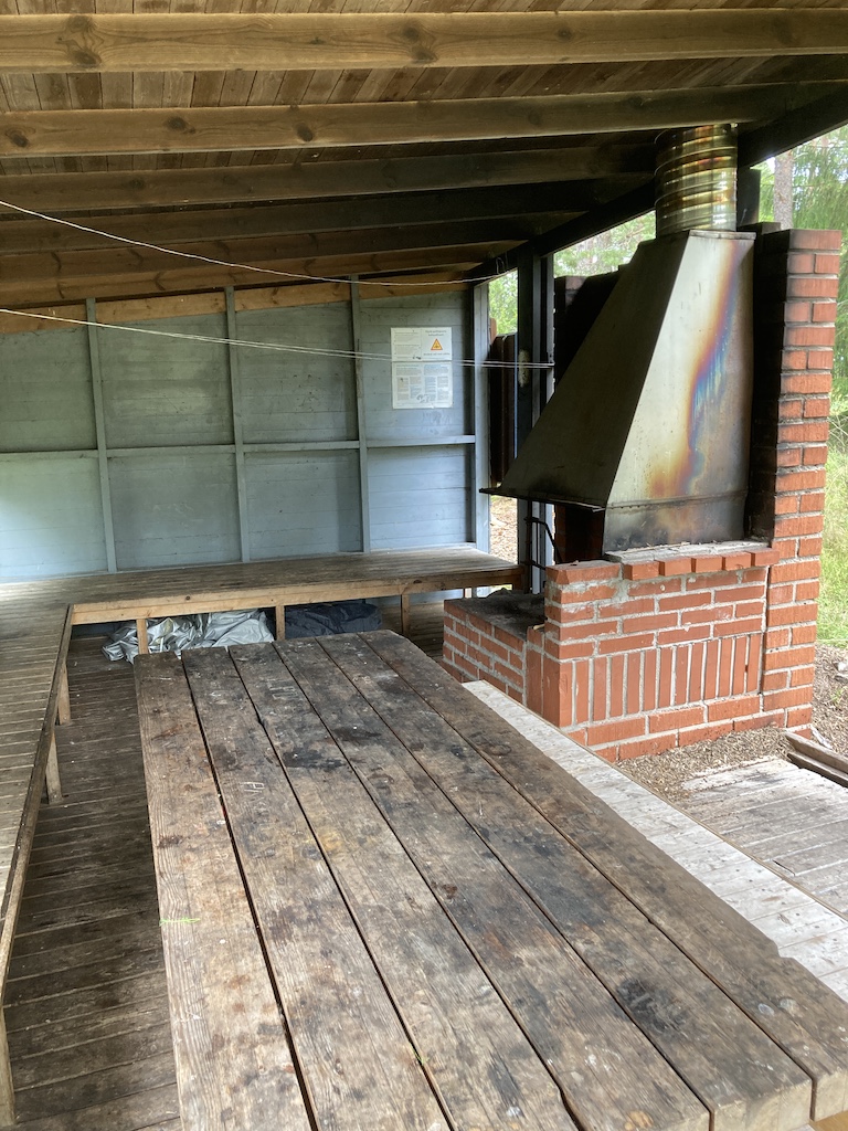 Tulentekopaikat ovat laiturilta vähän kauempana, mutta sellainen kuitenkin löytyy, niin katos kuin ”avonainenkin”.