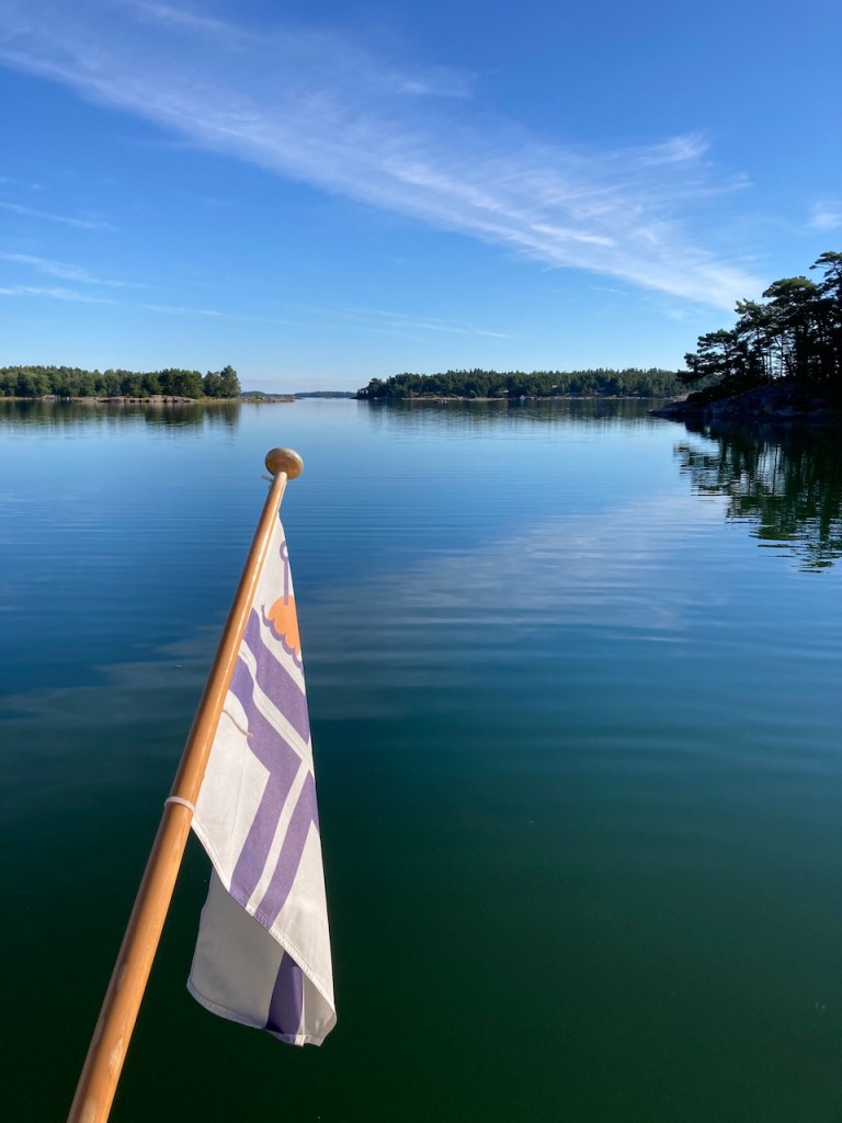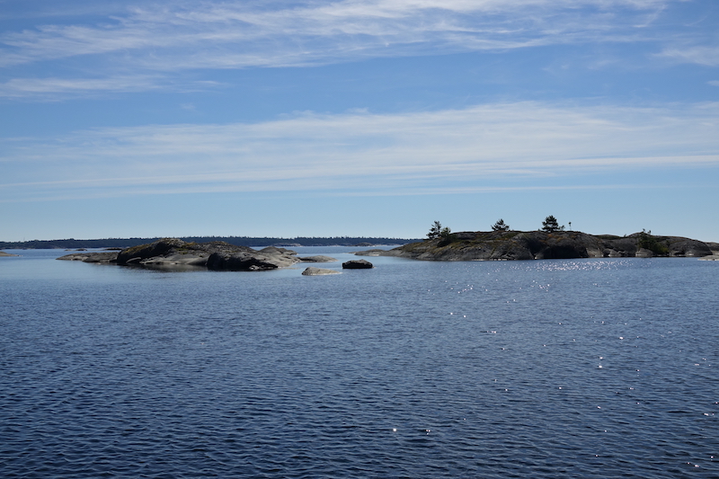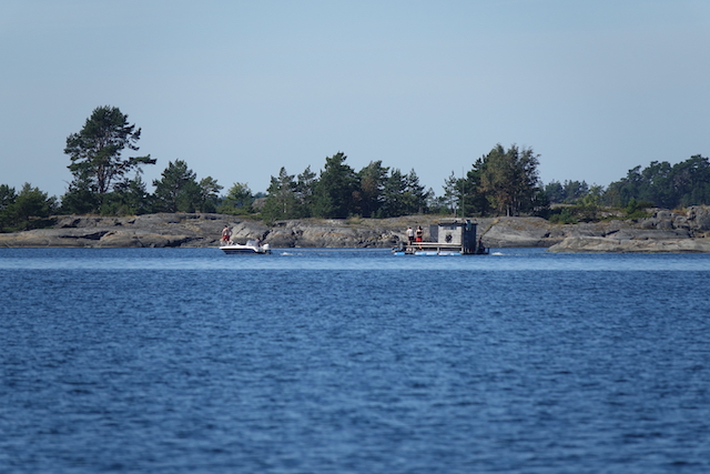 Vähän ennen puoltapäivää jotkut hinasivat saunalauttaansa tuonne luotojen/saarien taakse, onneksemme meiltä näkymättömiin. Ääni välillä kuului, mutta sitten nekin loppuivat.