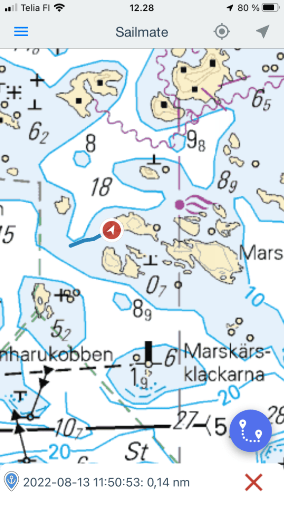 Lähestyminen alkoi tuolta siniseltä, eli pitäisi olla alle 10 metriä syvyyttä, mutta tuossapa oli 18 metriä koko matkan hyvin lähelle tätä saarta.