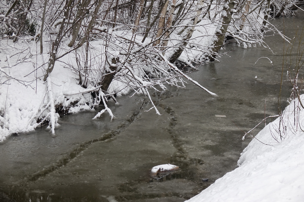 Suomenojan satamalle mennessä pieni puro alittaa tien ja joskun jopa tulvii tielle. Tammikuussa viimeeksi.