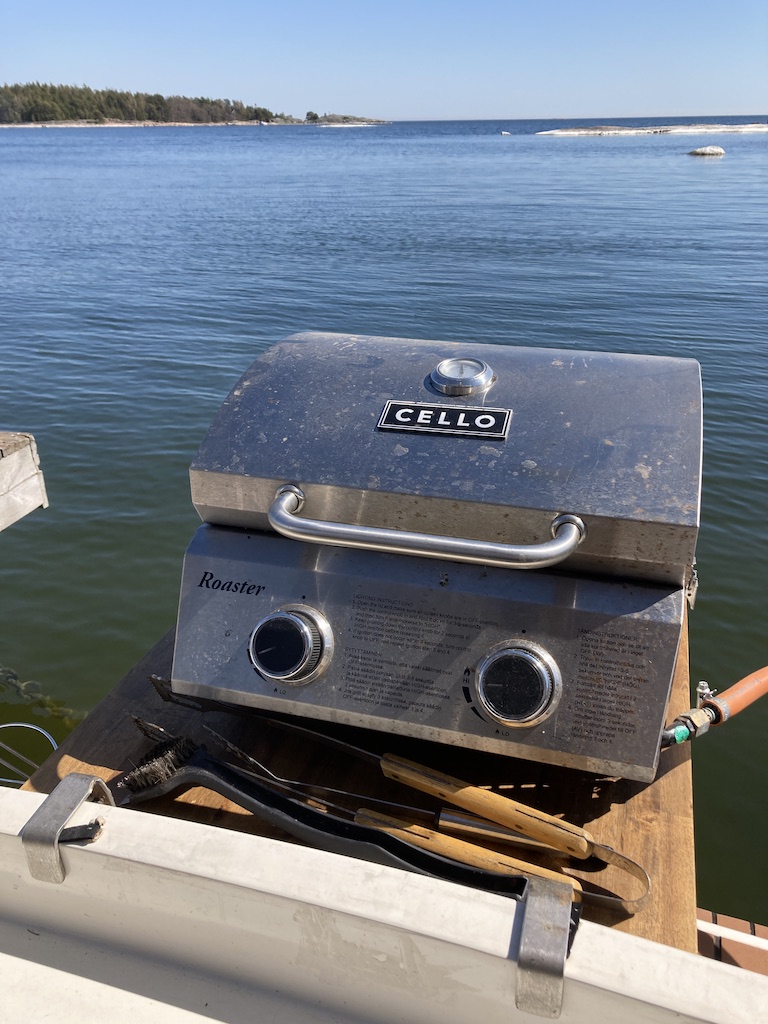 Ja täytyihän se grillaaminenkin kokeilla. Emn vain huomannut ottaa tuulen suuntaa huomioon. Loppupuolella jouduin hesarilla suojaamaan, jotaa olisin saanut broiskun rintafileet kypsiksi. Kuvan oton aikaan ei ollut tuulesta tietoakaan.