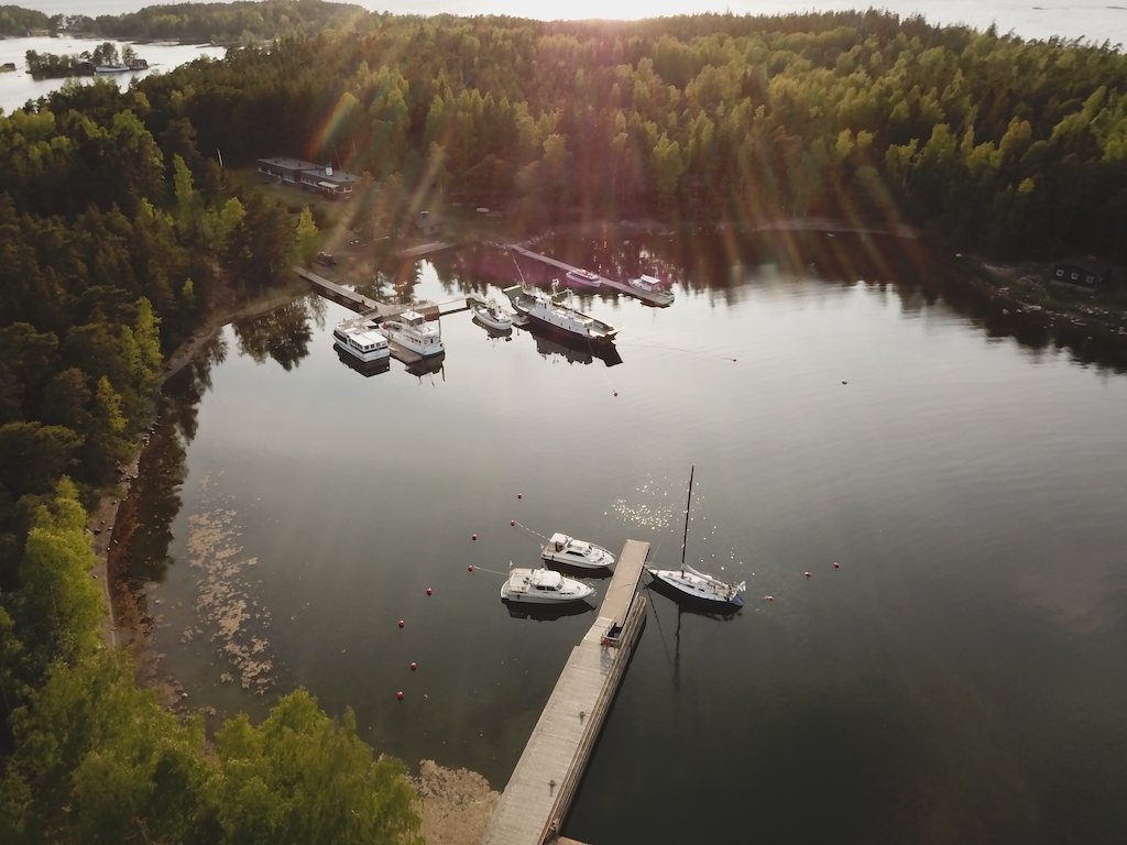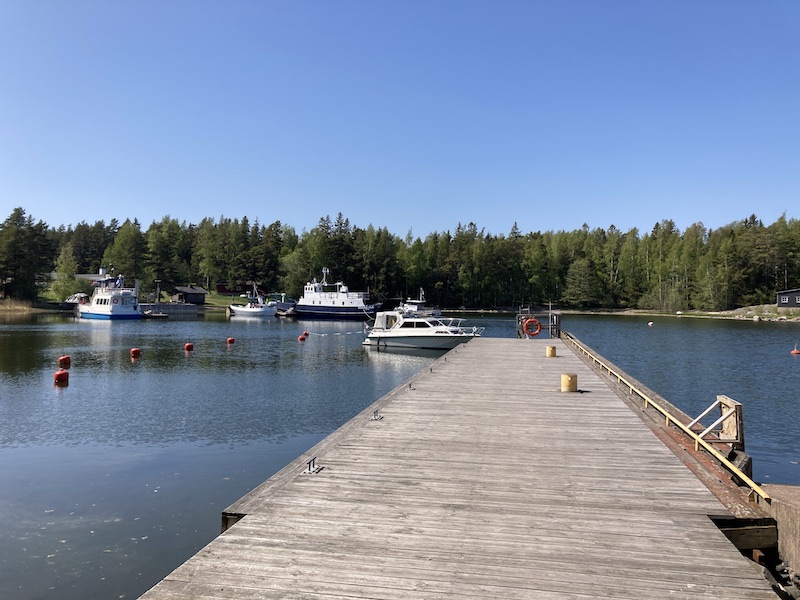 Retkivenelaiturissa oli tilaa, joten saimme valita rauhassa mihinkä poijuun kiinnitymme. Vastakkaisella rannalla on kauppalaivaston kotisatama, josta nyt yksi alus puuttuu, kun oli lähtenyt käymään aikataulunsa mukaisesti mantereella.