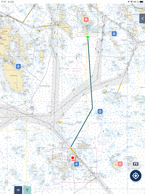 Käyttämäni Sailmate Nova karttaohjelma ipadissa on siitä kätevä, että tällä voi reitin suunnitella etukäteen ja sitten vain seurailee piirtämäänsä viivaa.