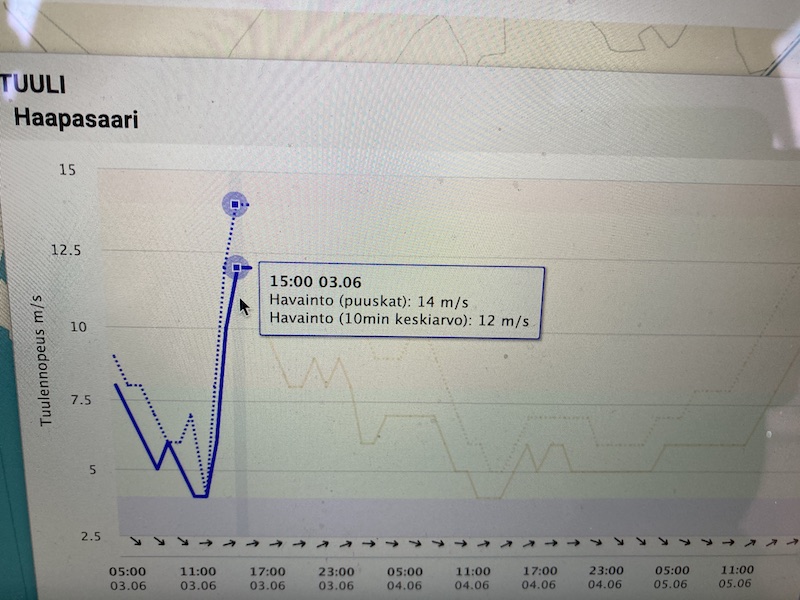 Iltapäiväksi oli luvattu navakkaa tuulta, joka sitten toteutui jopa kovempana kuin ennustettu. Olisi ollut melkoiset keikutukset, jos olisimme jääneet odottelemaan vaikkapa puolille päiville.