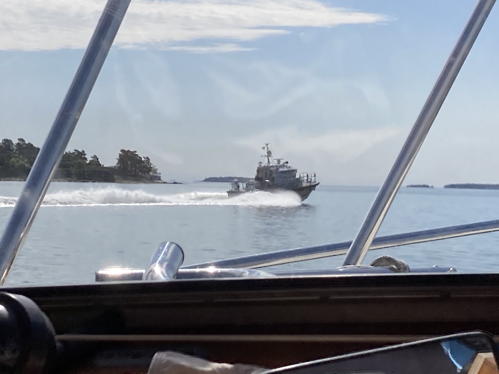 Vesitankki täyteen ja menoksi. Keli oli melkeinpä tyyni. Rannikkovartioston vene pyörähti samalla satamassa, kun olimme jo lähteneet pilttuustamme. Se lähtikin seuraamaan meitä ja pysyikin pitkään meidän perässä. Nopeusrajoitus alueen jälkeen ajoin hetken hissukseen, mutta kun se ei lähtenytkään meidän ohi, nostin nopeutemme normaaliksi, 25 solmuksi.