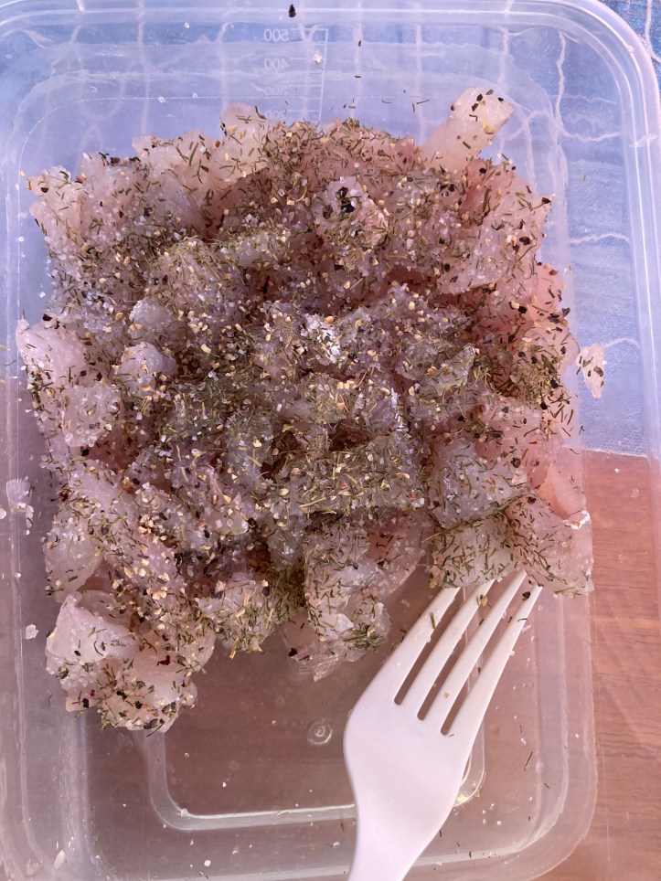 Sitten silpuksi. Kun merisuola, pippuri ja tilli vielä lisätty, on Tartaria. Sokeria ei ollut, joten sitä ei sitten ole.