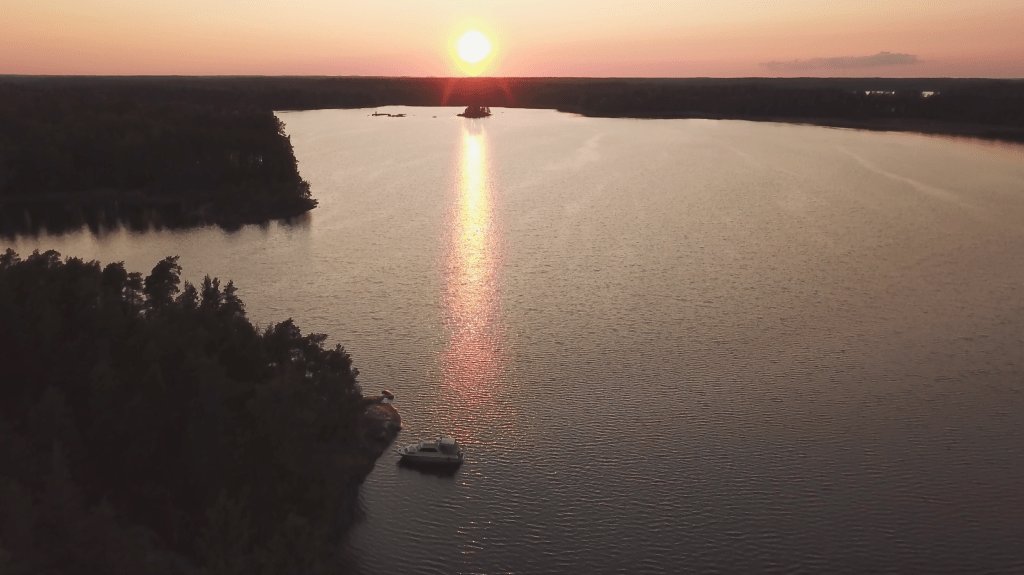 Kävin sitten ulkoiluttamassa vielä tuulen tyynnyttyä Mavicia. Koska yötä varten olin jo muuttanut veneen kiinnityksen siten, ettei maihin pääse kastelematta itseään, lähetin dronen veneen katolta.