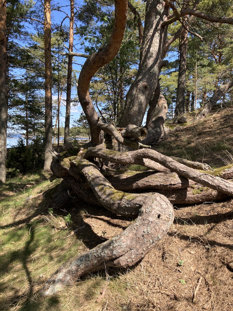 Tuollaista juurakkoa en ole ennen nähnyt. Useampi puu kilpaillut yläilmoihin. On siinä menty vaakasuuntaankin paremman ravinnon perässä.