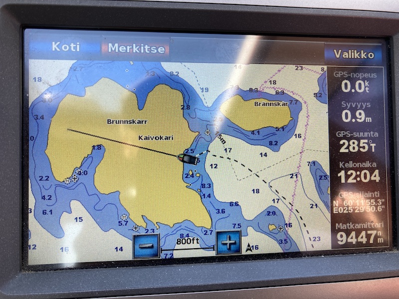 Rantautumispaikaksi valikoitui tällä kertaa itärannan kohta, missä on muutama kiinnityrengas kalliossa. Vesi on nyt tosi alhaalla, mutta pääsimme silti rantautumaan. Kyllä tähän purkkarillakin mahtuisi normi veden korkeudella. Nytkin veneemme perässä on vettä pari metriä. Meillähän kaikuanturi on keulasta noin kolmen metrin päässä eikä perässä.